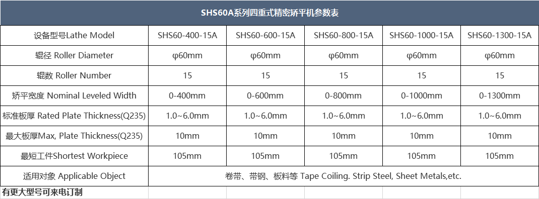 四/六重式精密整平機(jī)是通過(guò)整平機(jī)多組滾筒滾壓式矯平,從而達(dá)到平整效果。四/六重式高精密整平機(jī)采用上、下排矯平工作輥與支撐軸承(輪)之間加裝支撐輥,構(gòu)成上下各二/三重共四/六重的組輥結(jié)構(gòu);矯平輥受力分布均勻,結(jié)構(gòu)剛性好,工作輥撓曲變形小,矯平精度高,行程諧波衰減性矯直,從根本上解決普通矯平常見(jiàn)的矯不平、易產(chǎn)生輥印壓痕、工件塌角、鐮刀彎等問(wèn)題,提高板材的矯正精度,適用范圍廣,材料表面不會(huì)留下輥壓痕跡,矯正精度高。