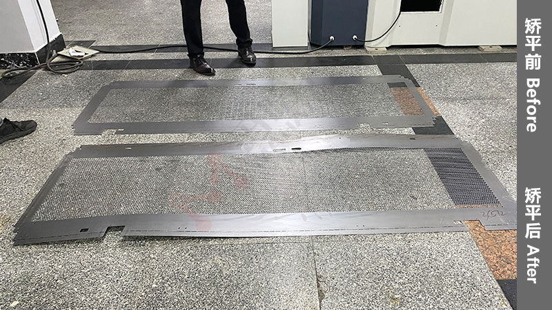 瑪哈特校平機的矯平技術能使能使金屬材料的各個部分有選擇地伸展,在材料屈服點以下,將板材中纖維較短的部分按比例拉伸,得到均勻的纖維長度,提升網板的質量的同時,不會改變網板的厚度。